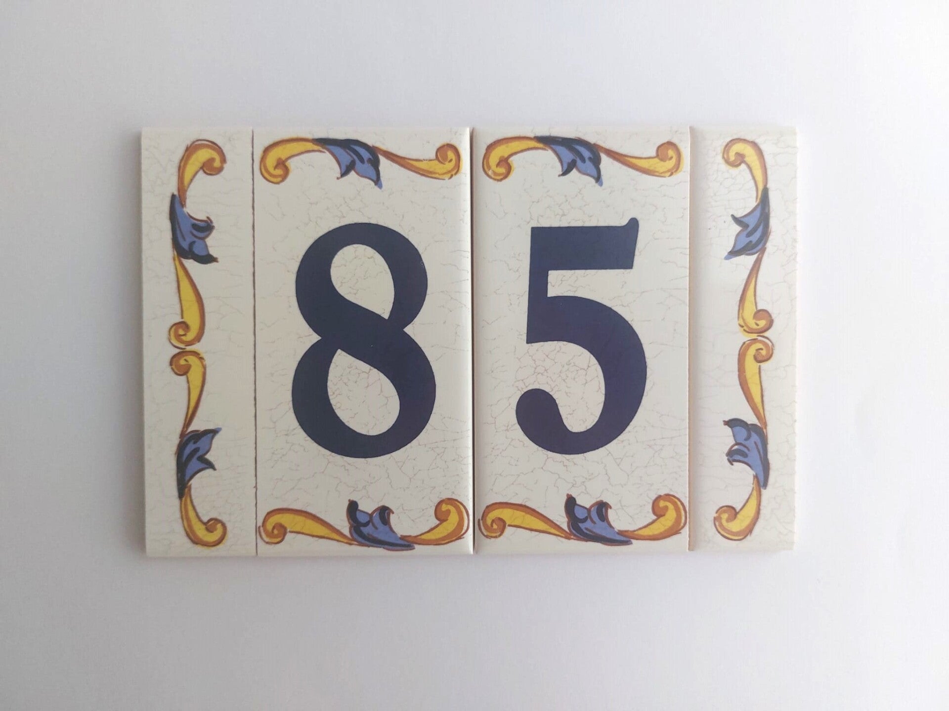 Huisnummer op tegel, zoals je dat veel in Spanje, Portugal, en Italië tegenkomt. Met de handgemaakt en met bijzonder sprekende kleuren.