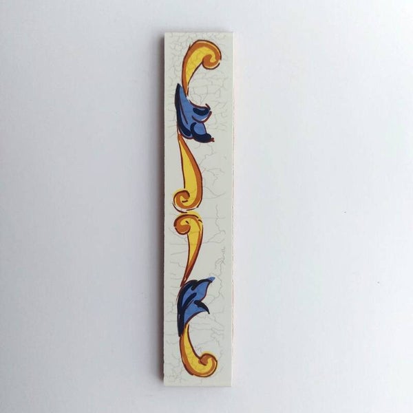 Huisnummer met geel / blauwe randversiering. Deze serie is niet handbeschilderd, maar zijn gemaakt met een keramische diepdruktechniek.