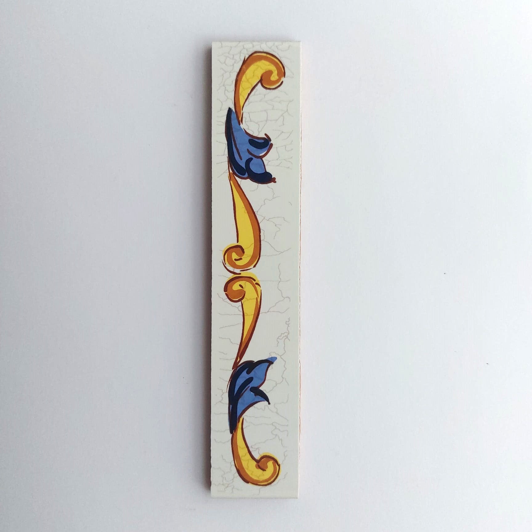Huisnummer met geel / blauwe randversiering. Deze serie is niet handbeschilderd, maar zijn gemaakt met een keramische diepdruktechniek.