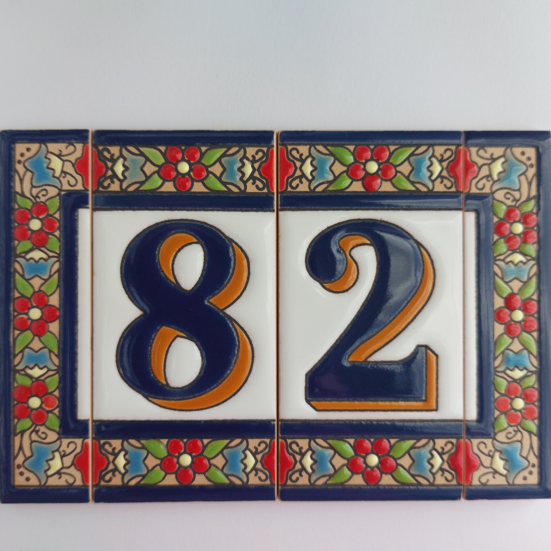 Huisnummer op tegel, zoals je dat veel in Spanje, Portugal, en Italië tegenkomt. Met de handgemaakt en met bijzonder sprekende kleuren.