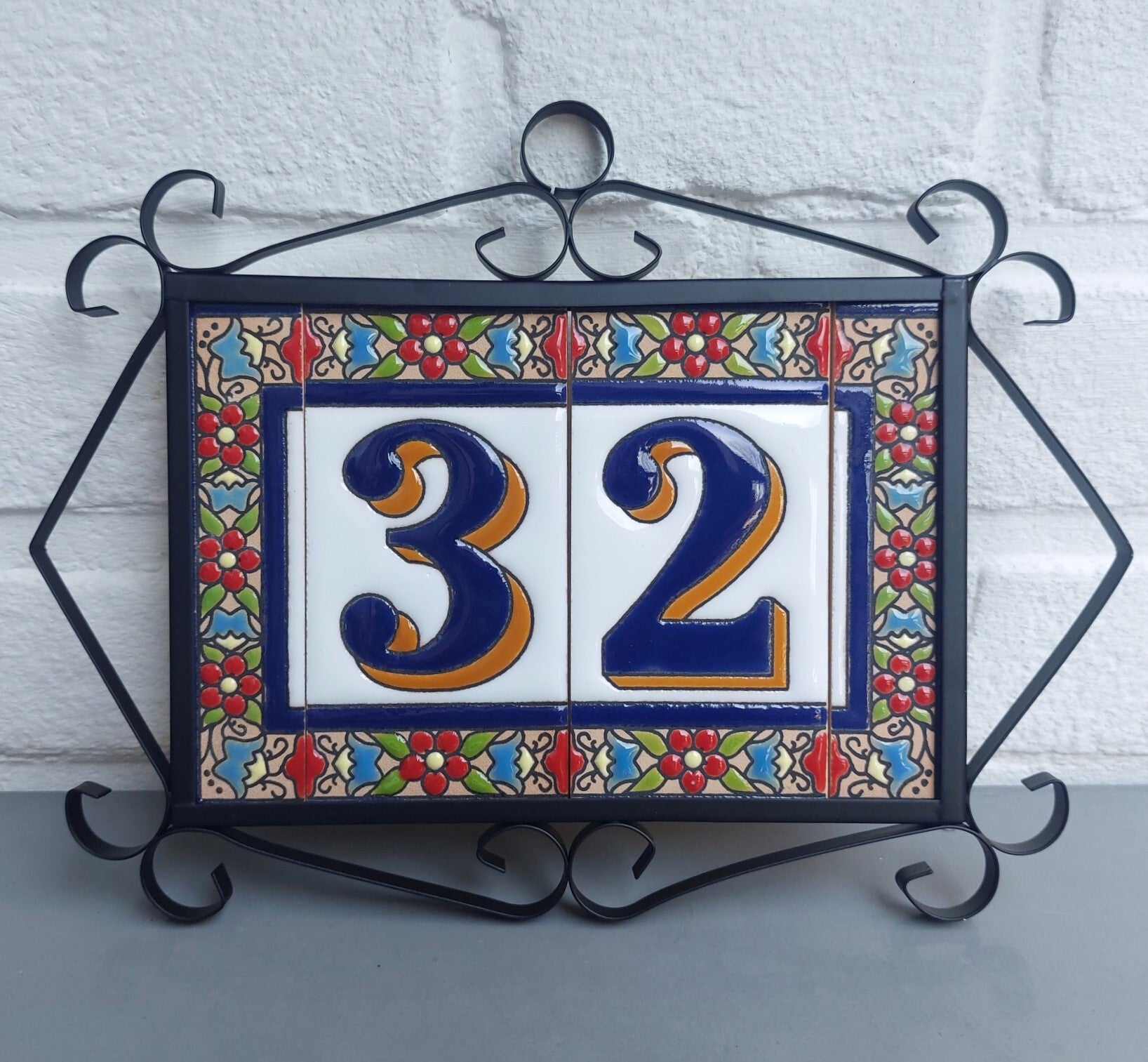 Huisnummer op tegel, zoals je dat veel in Spanje, Portugal, en Italië tegenkomt. Met de handgemaakt en met bijzonder sprekende kleuren.