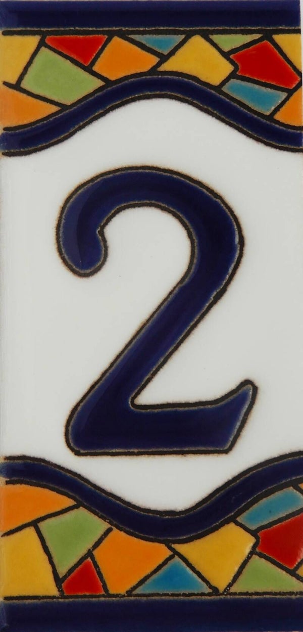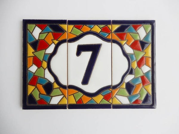 Huisnummer met de hand geschilderd in kleurrijke mozaiek stijl.