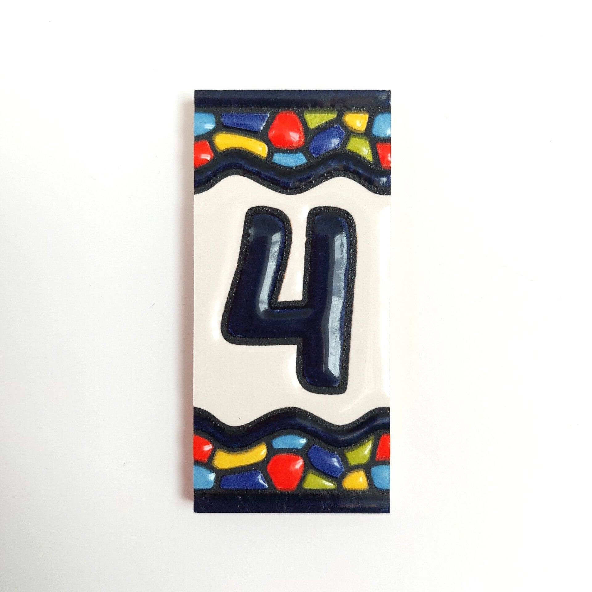 Huisnummer op tegel, zoals je dat veel in Spanje, Portugal, en Italië tegenkomt. Met de handgemaakt en met bijzonder sprekende kleuren.